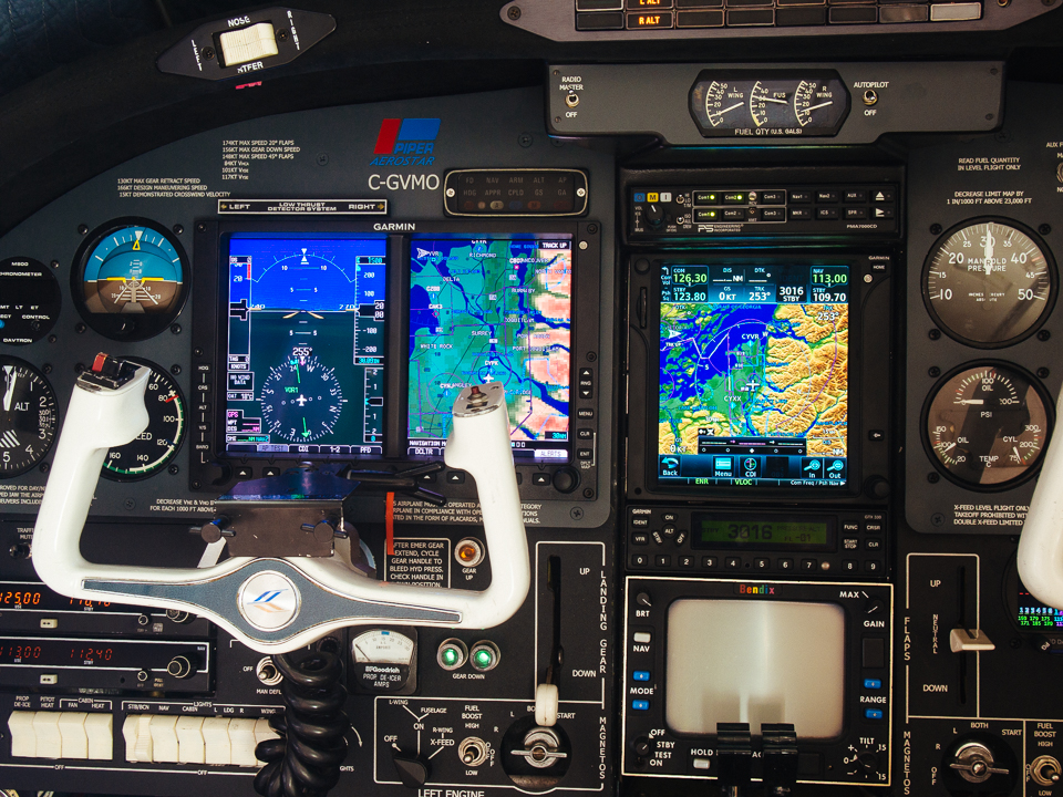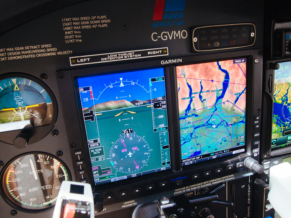While the Garmin G600 and GTN750 you see here are certainly top of the line pieces of equipment, what makes this project interesting is the high level of integration between new and old systems. As we’ve stated before on this page, Maxcraft’s technicians are not only installation experts, but integration experts. It’s one thing to take a new GTN750, plug it in, turn it on, and leave half its capabilities crippled. It’s quite another to configure it for maximum functionality while also making it talk to a twenty year-old autopilot. At the end of the day, complete integration involved no less than five existing systems of various vintages, (DME, NAV/COM, autopilot, engine probes) as well as four new systems (PFD, GPS/NAV/COM, ADS-B, TAS, graphic engine monitor). As usual, one of our custom cut laser-engraved coated Maxpanels was installed as well as a matching lower panel overlay. Colour matched and treated with the same durable coating, this thin and light overlay ensured a uniform aesthetic between our new upper panel and the (mostly) unaltered lower panel.