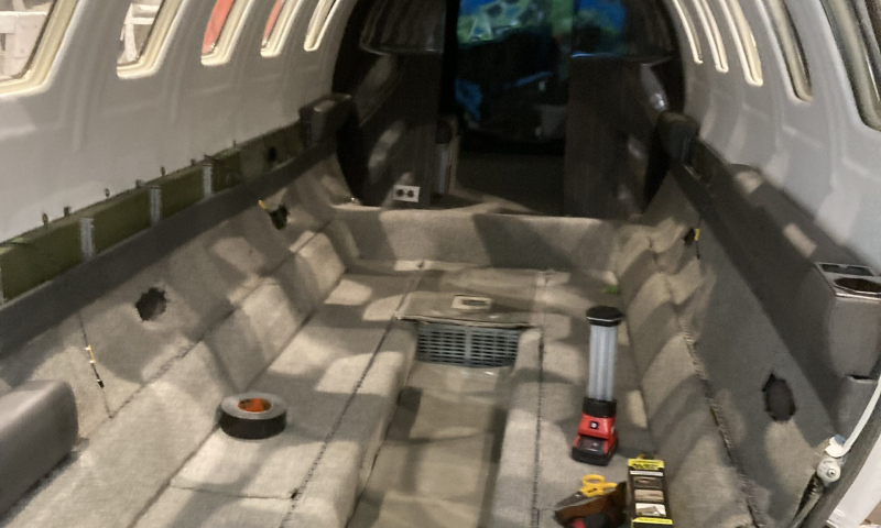The interior was removed to receive several upgrades from one of the customer’s vendors. Completing this work concurrently with the avionics upgrades allowed for the customer to save both time and money, by reducing downtime, and only needing to pay for the labour to remove and reinstall the interior once. After the upgrades were completed, the interior was returned to our hangar where it was reinstalled after all the avionics wiring had been run under the interior. As this aircraft is going to be the company’s flagship and “pride and joy”, they wanted it to look and feel luxurious, and this interior does a fantastic job at doing just that.