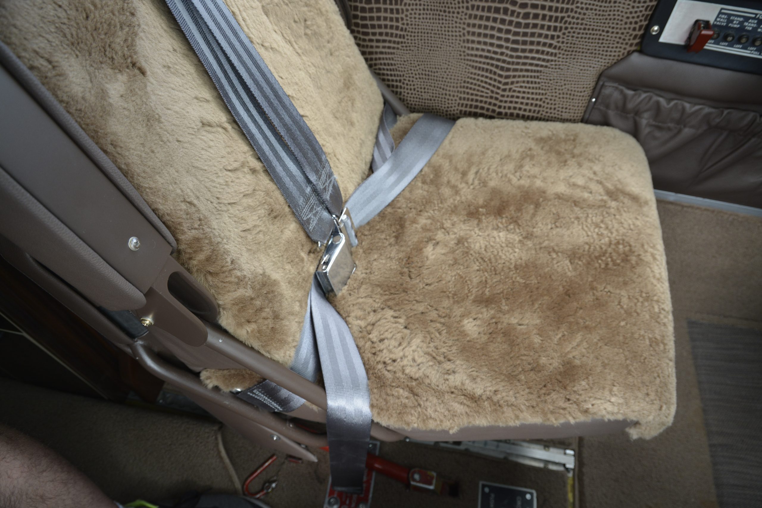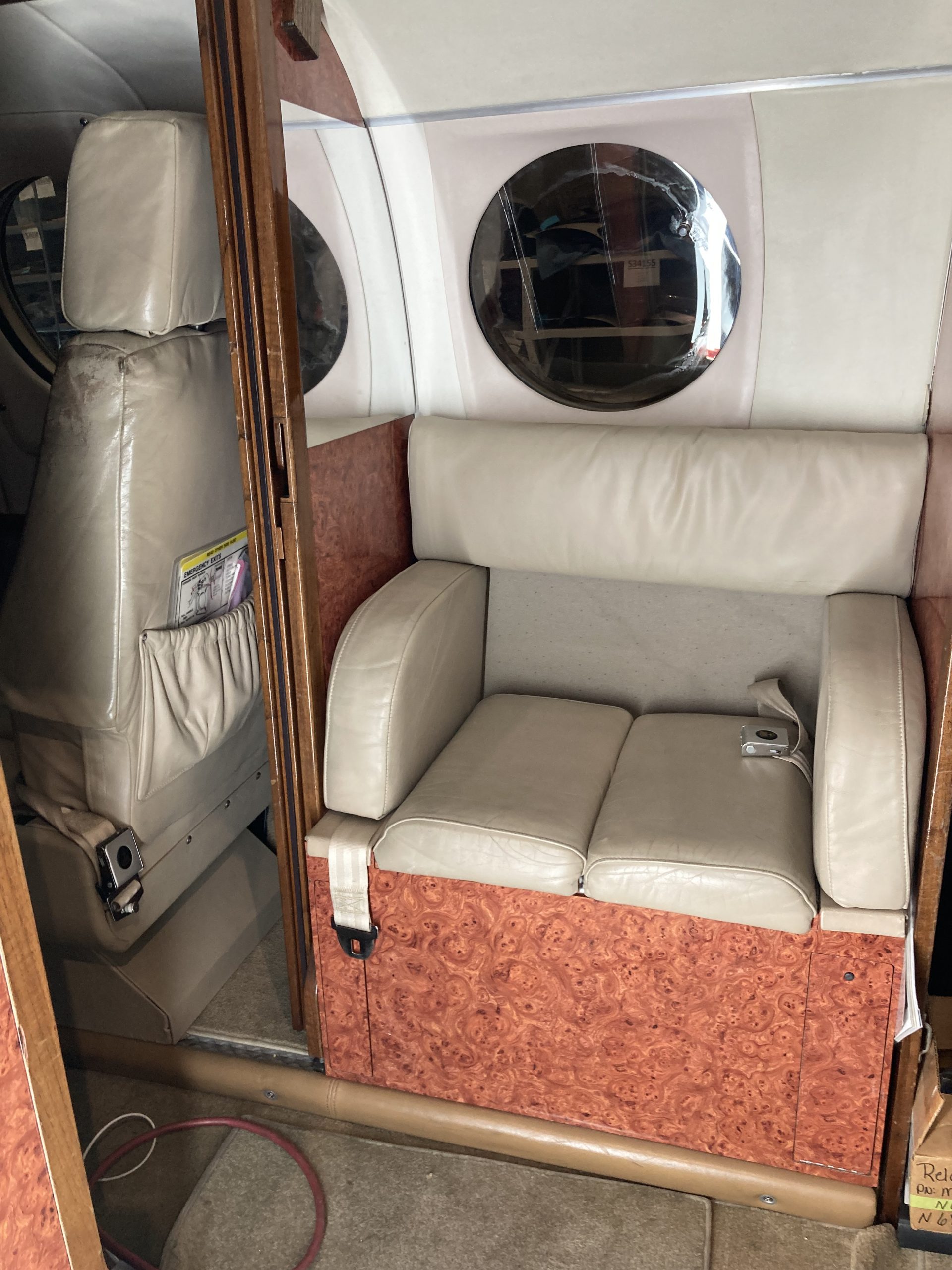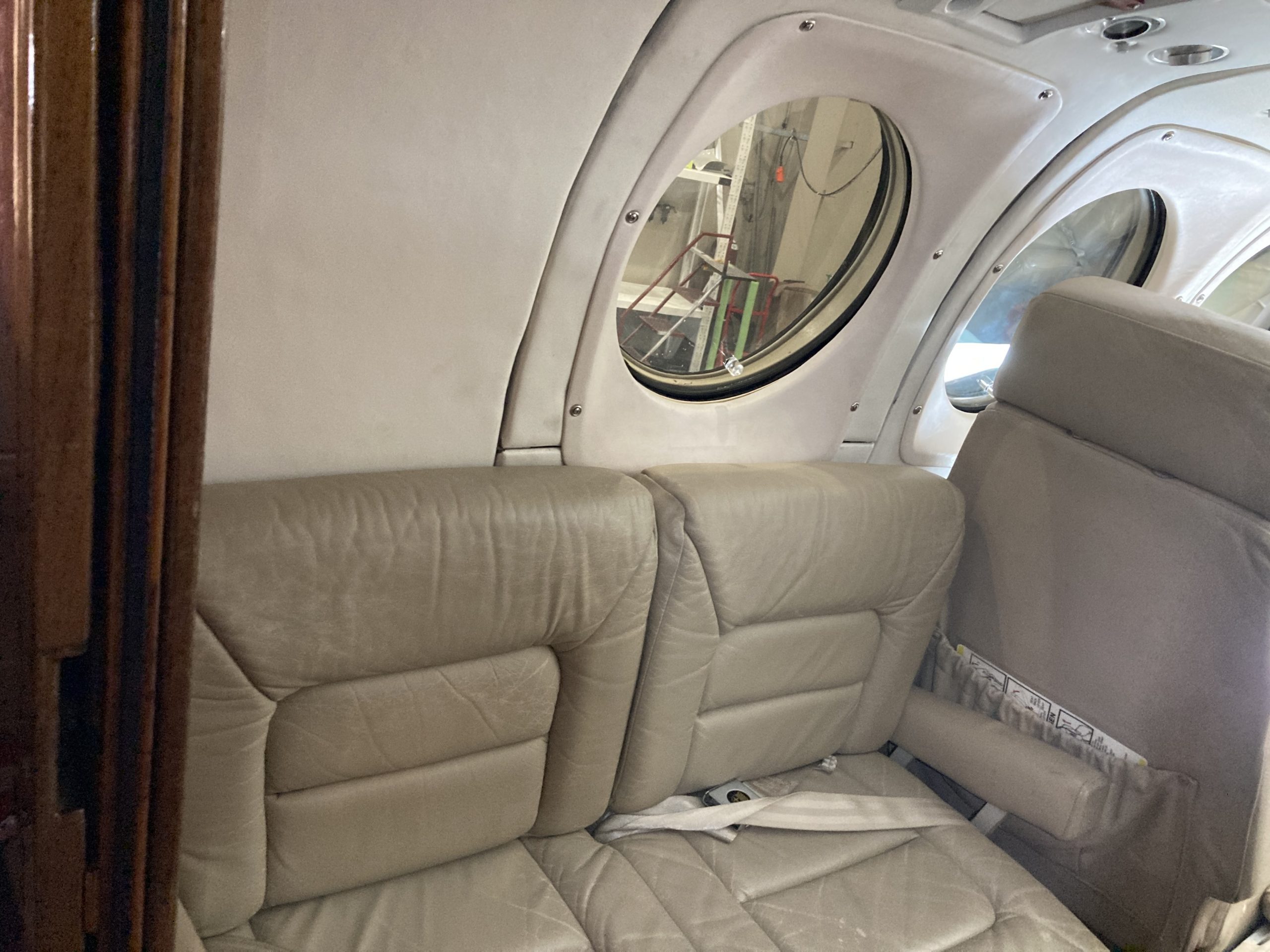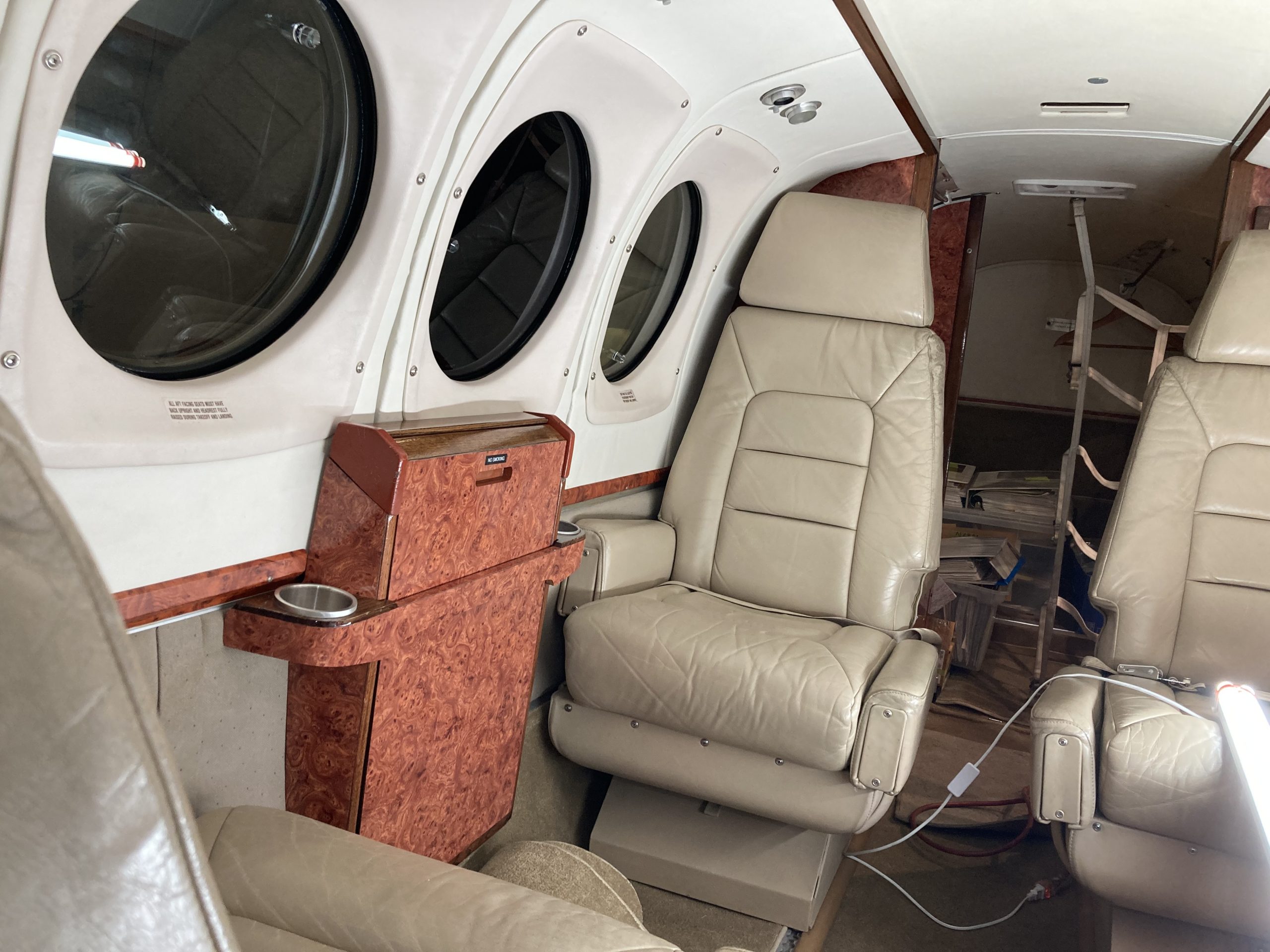 Since this aircraft is the customer’s pride and joy, we teamed up with one of our Trusted Affiliate Network partners, Port Interiors to create a one-of-a-kind custom interior for this King Air. This would include replacing the leather on the passenger seats, new sheepskin pilot and copilot seats, all new trim pieces throughout the aircraft, and even the stairs into the aircraft were upgraded.