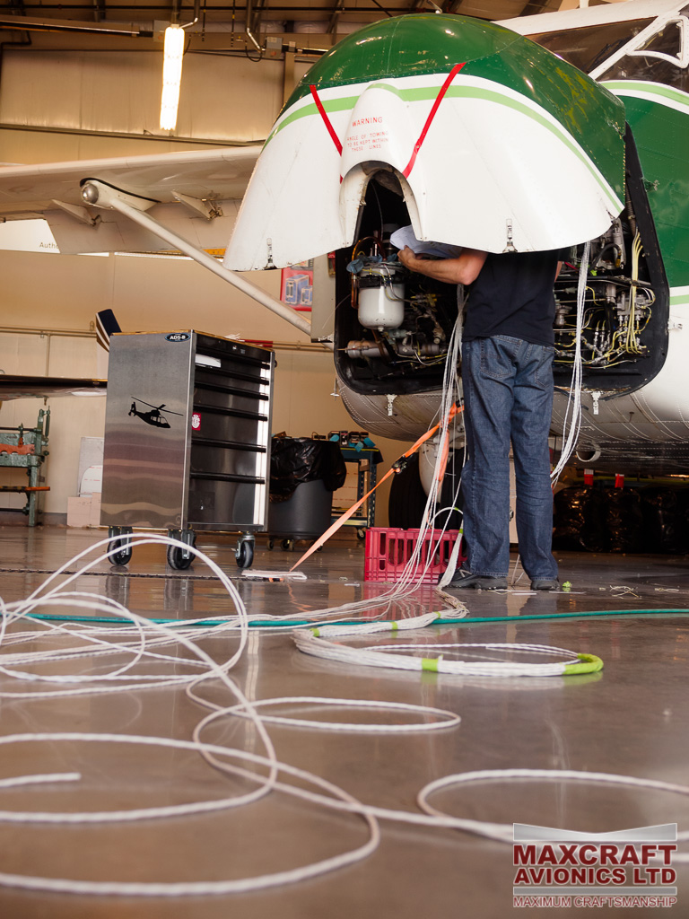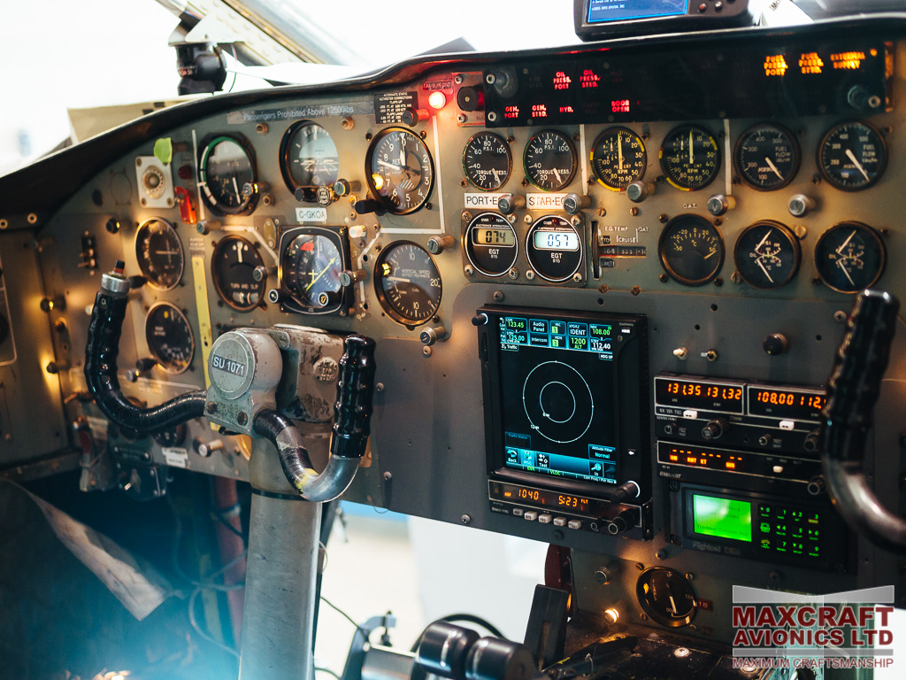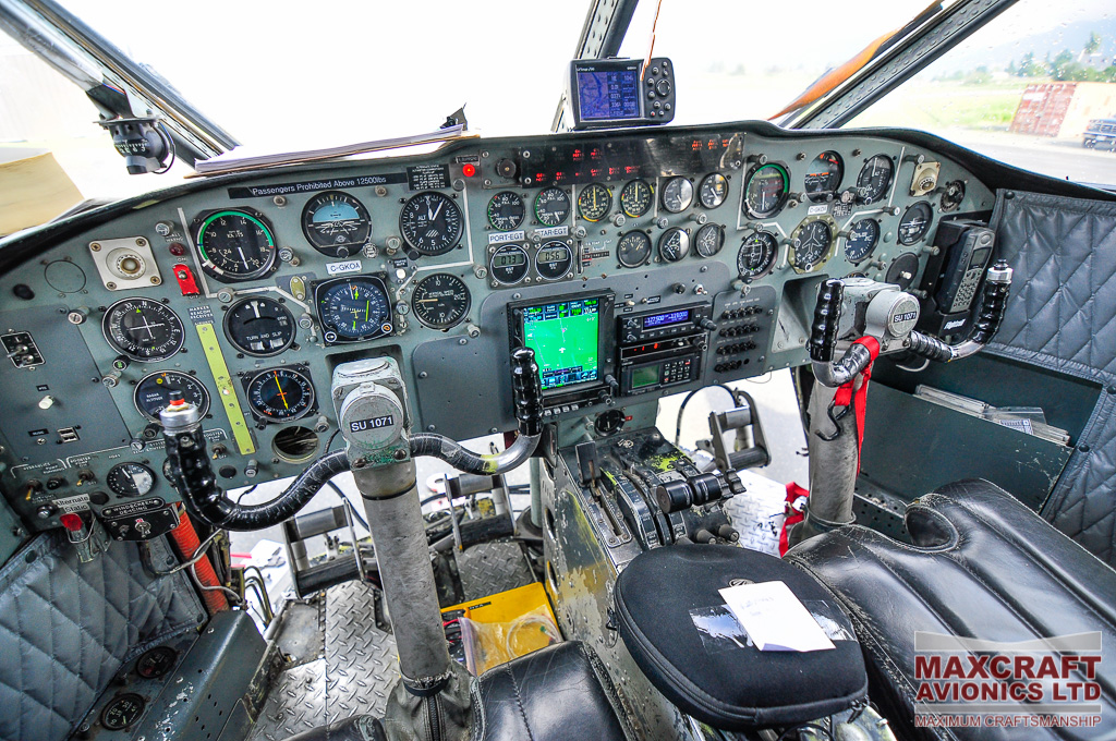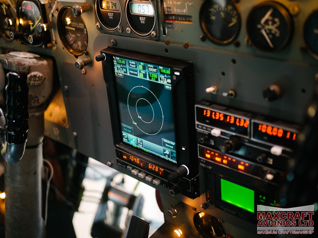 In addition to a modern GTN 750 package with TCAS and a remote audio panel, Maxcraft technicians have also installed dual diversity mode transponders and a GNC-255 NAV/COMM, both of which were specified as mandatory for operation in Europe. While ES transponders have been mandatory in Europe for sometime now, the 8.33 MHZ channel spacing requirement which prompted a GNC-255 is fairly recent. Mission-specific equipment installed by Maxcraft include a custom-built jump light system, and a cabin altimeter.